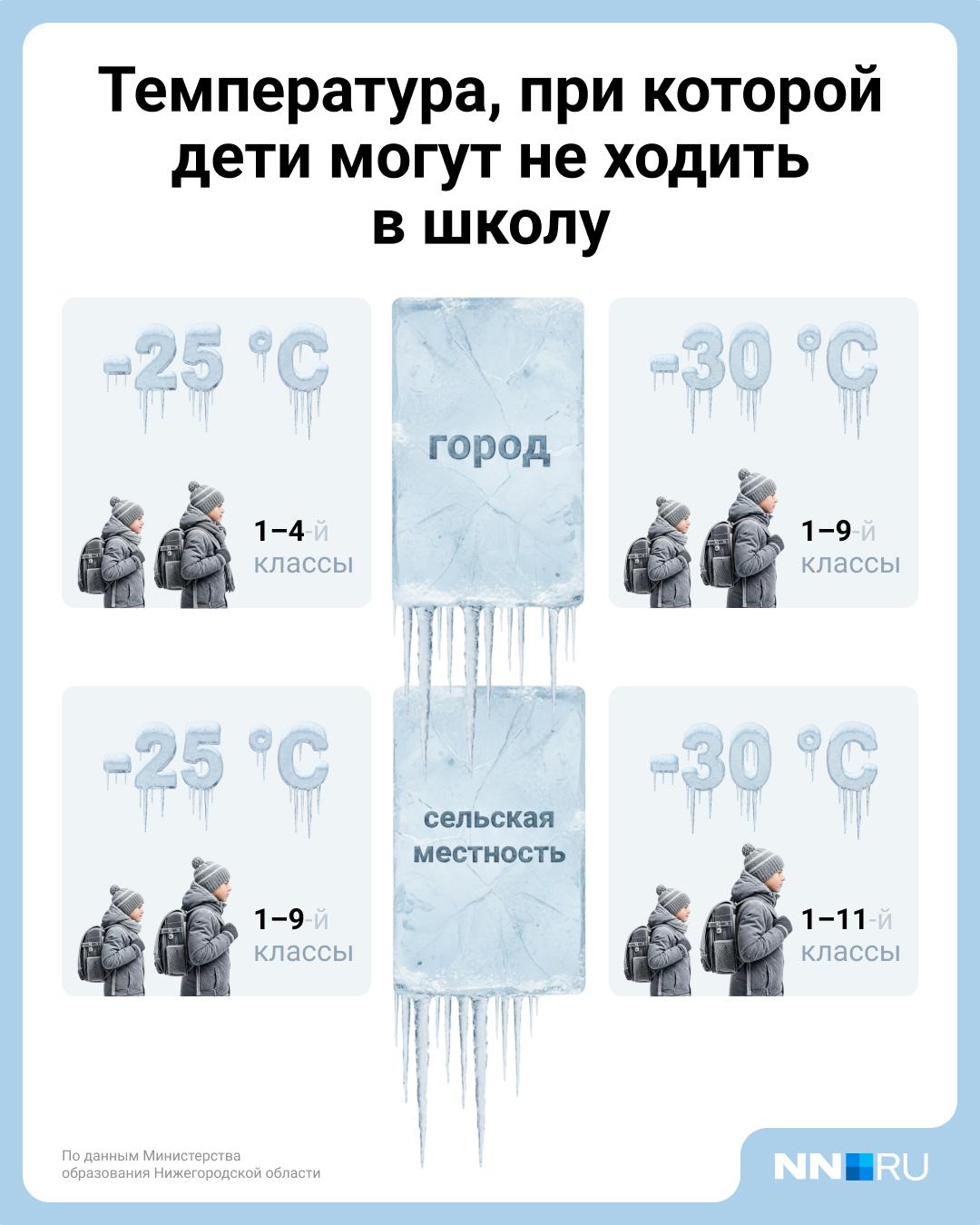 При понижении температуры до -30 градусов в городе не посещать школу могут ученики с первого по девятый класс. В селах в такую погоду к ним добавляются старшеклассники — десятые и одиннадцатые классы.