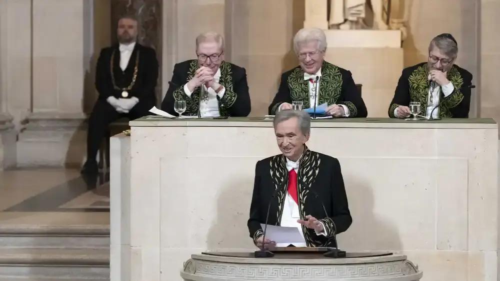 Арно, возглавляющий холдинг LVMH, в который входят такие бренды, как Christian Dior, Louis Vuitton, Givenchy, Guerlain и Chaumet, занял кресло в секции «Политическая экономия, статистика и финансы». Церемониальный меч от ювелирного дома Chaumet ему вручил бывший министр финансов Франции Бруно Ле Мер.