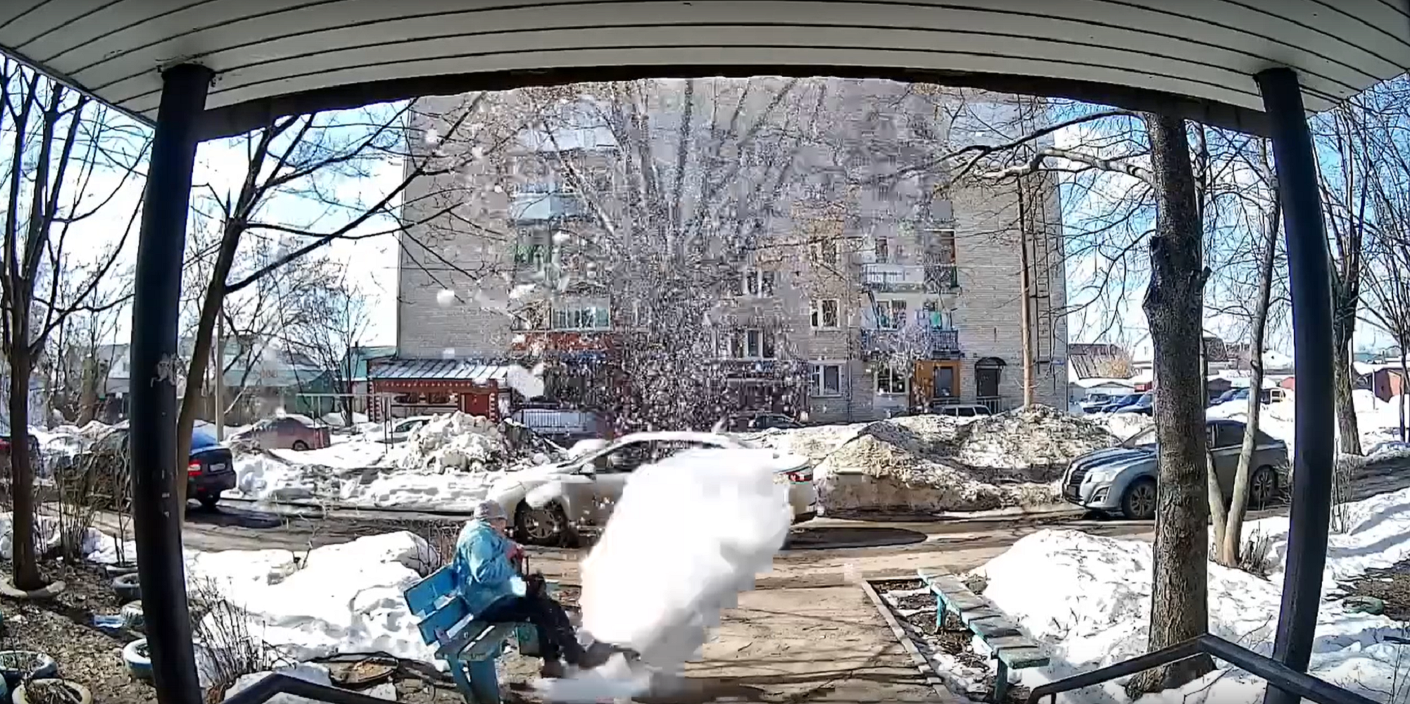 Камера наблюдения зафиксировала момент обрушения снега с козырька