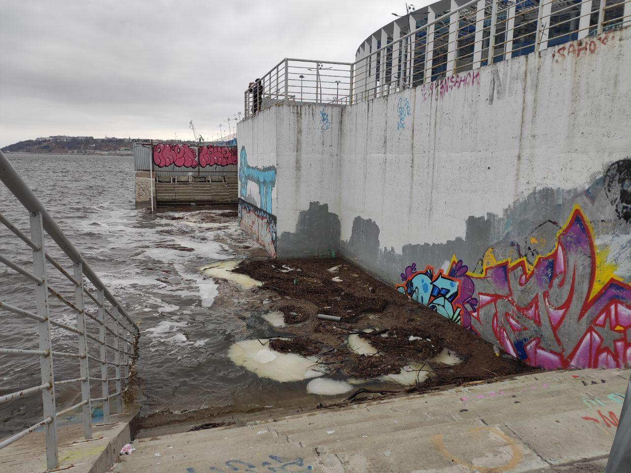 Берегоукрепительные конструкции здесь значительно повреждены. Весенний паводок привёл к частичному затоплению лестниц, спускающихся к Волге, и уровень воды продолжает повышаться.