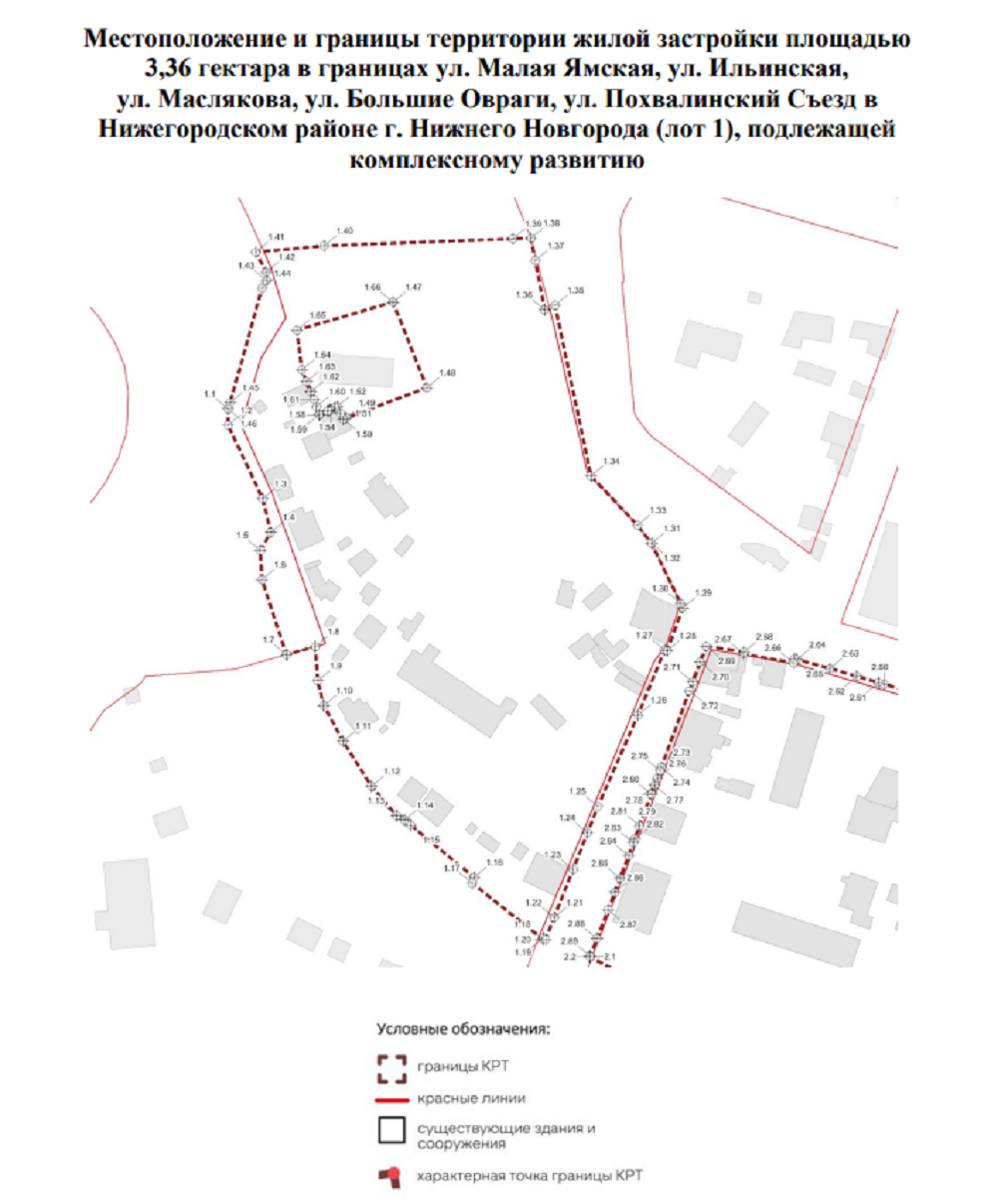 В марте правительство Нижегородской области установило границы территории, подлежащей комплексному развитию. Площадь участка жилой застройки составляет 3,36 гектара. Он расположен в границах улиц Малой Ямской, Ильинской, Маслякова, Большие Овраги и Похвалинского Съезда.