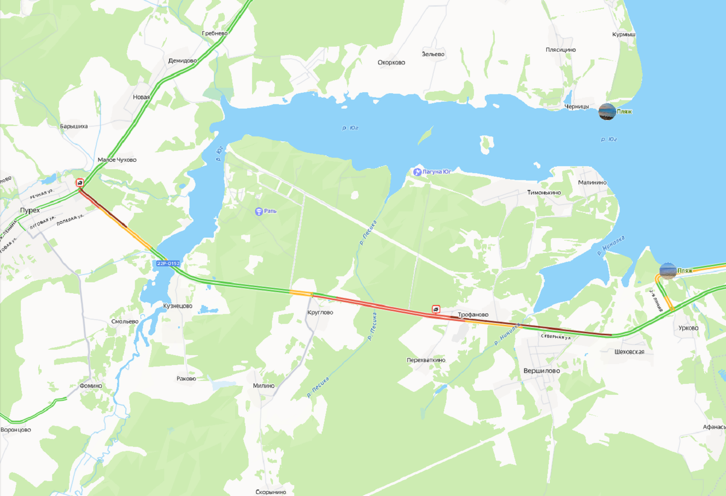 Движение на этом участке дороги полностью остановлено уже несколько часов. Пробки образовались в обе стороны, но наиболее сложная ситуация сложилась в направлении Чкаловска. Затор растянулся от деревни Шеховская до Круглово.
