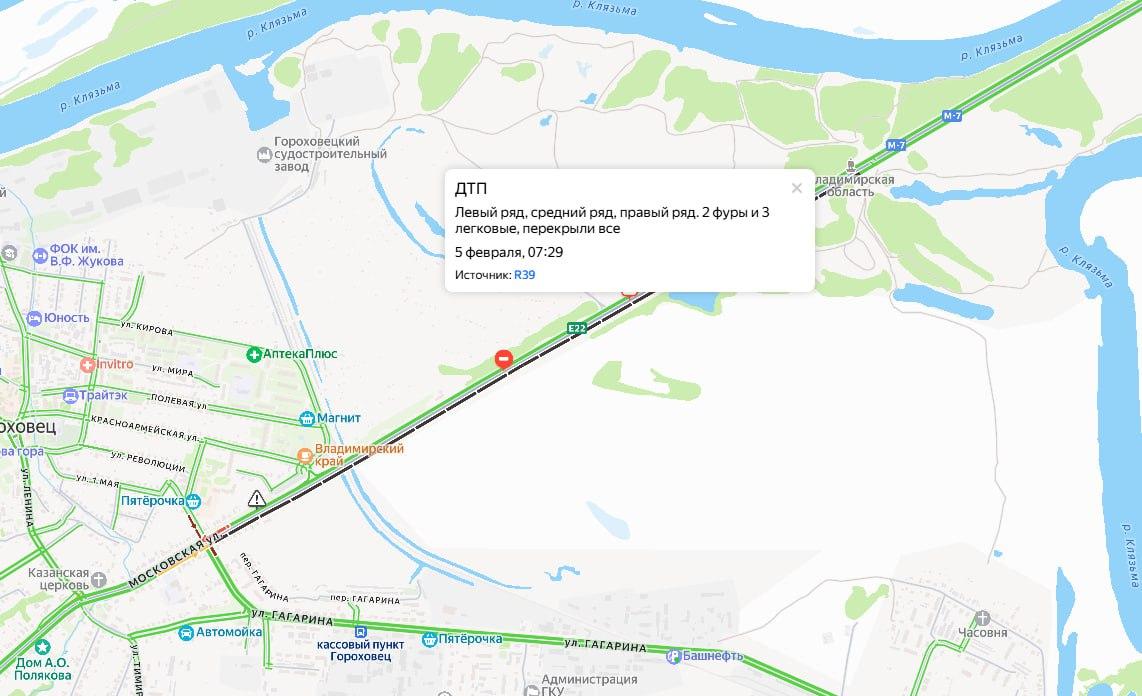 Движение перекрыто на участке от улицы Московской в Гороховце до знака, обозначающего въезд во Владимирскую область. Столкновение двух фур и трёх легковушек заблокировало почти всю проезжую часть.