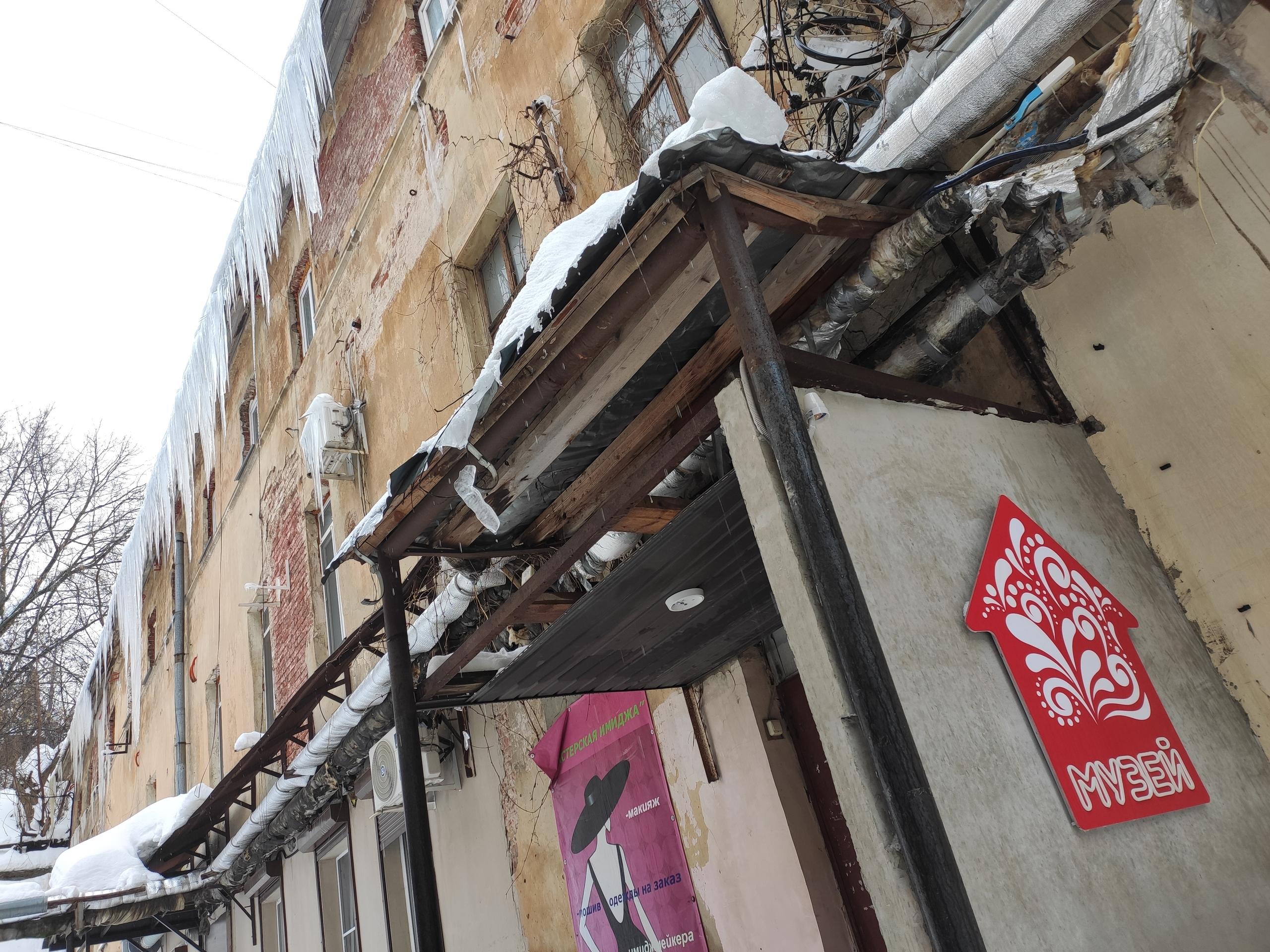 На месте происшествия до сих пор видны свисающие с крыши сосульки, с которых капает вода. На земле лежат обломки льда.