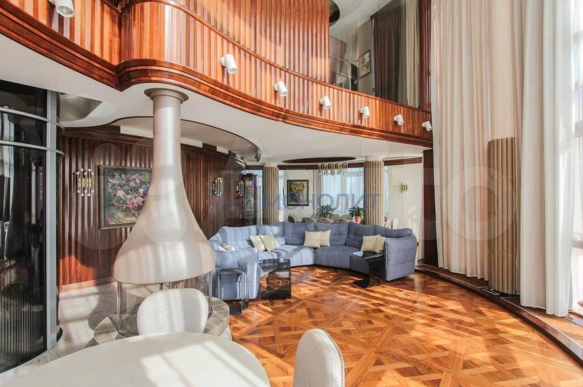 Апартаменты занимают шестой и седьмой этажи. Ремонт выполнен по авторскому дизайн-проекту с использованием эксклюзивных материалов. На первом уровне расположены гостиная с камином, просторная кухня, столовая, гостевой санузел и спальня.