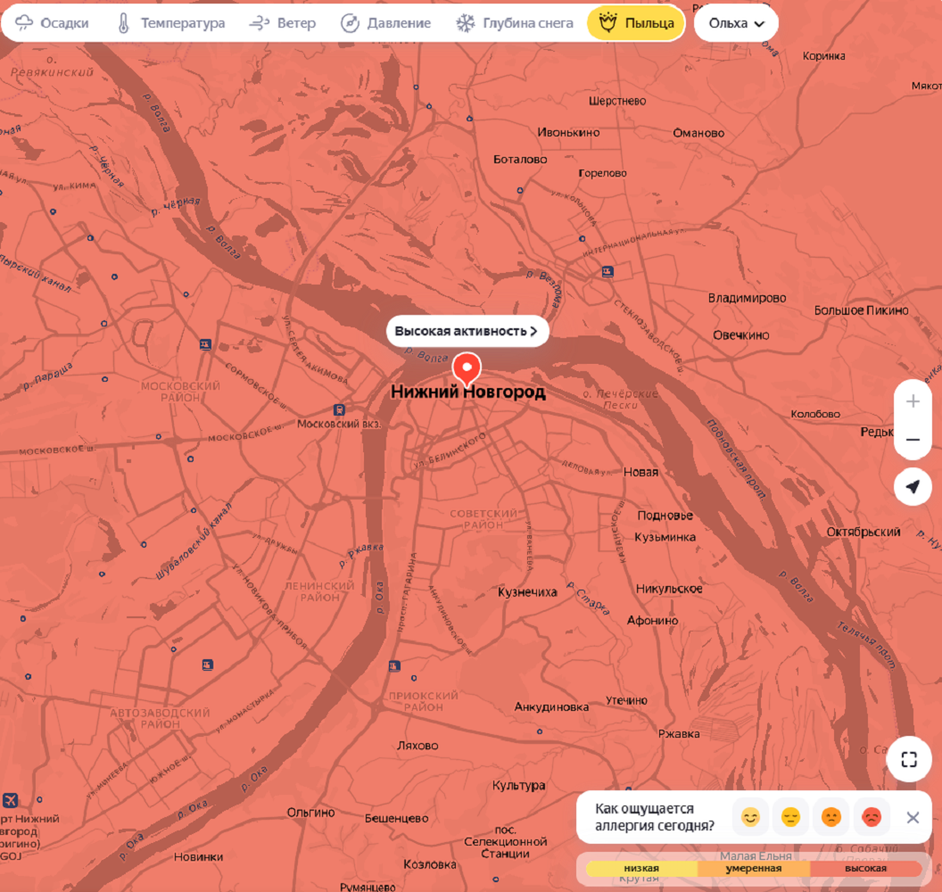 Интерактивная карта сервиса «Яндекс.Погода» отображает высокий уровень пыльцы в воздухе города. Для аллергиков это означает начало сезона неприятных симптомов.