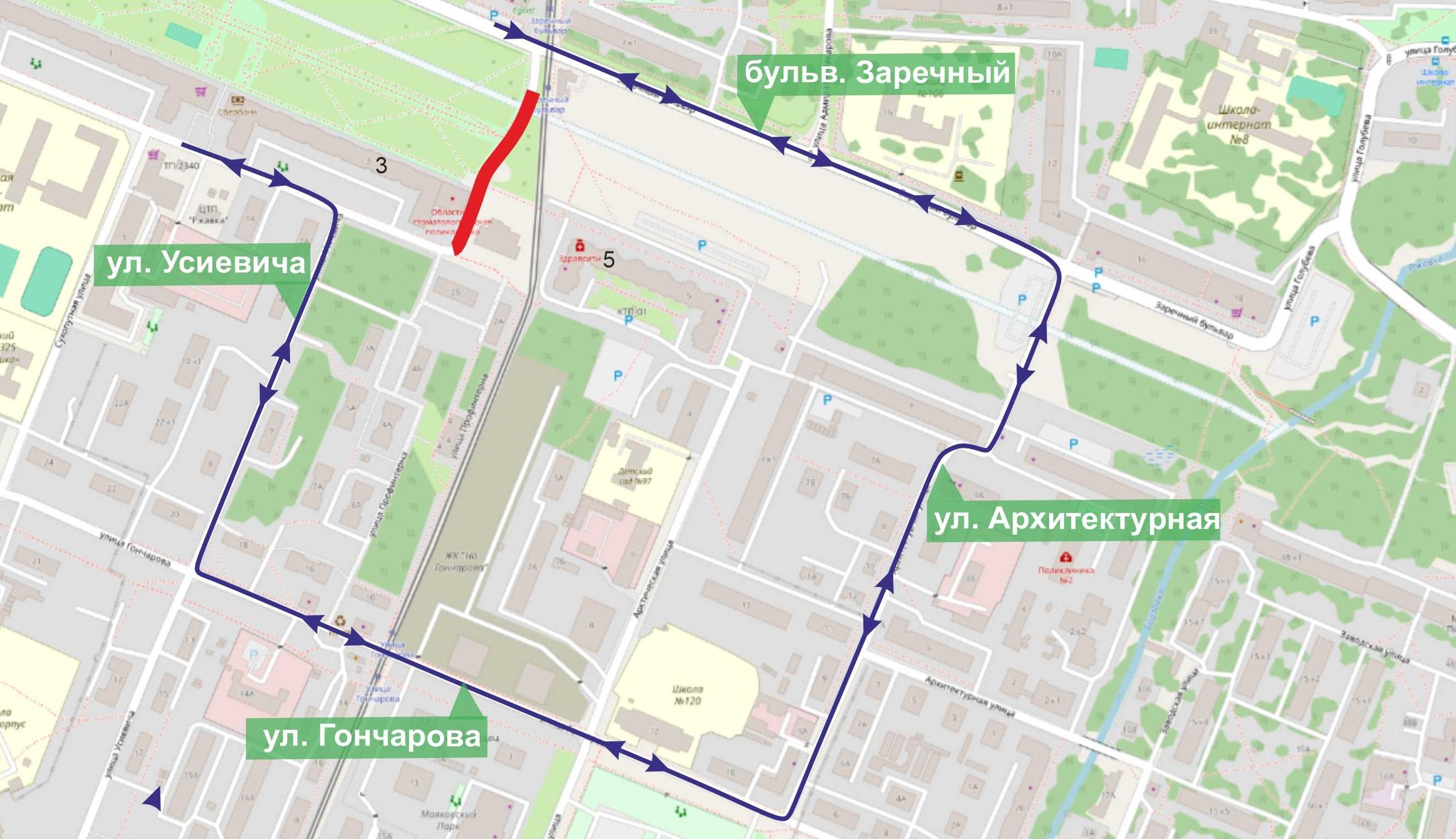 Перекрытие необходимо для прокладки новых водопроводных линий. Автомобилистам рекомендуют использовать для объезда улицы Архитектурную, Гончарова и Усиевича.