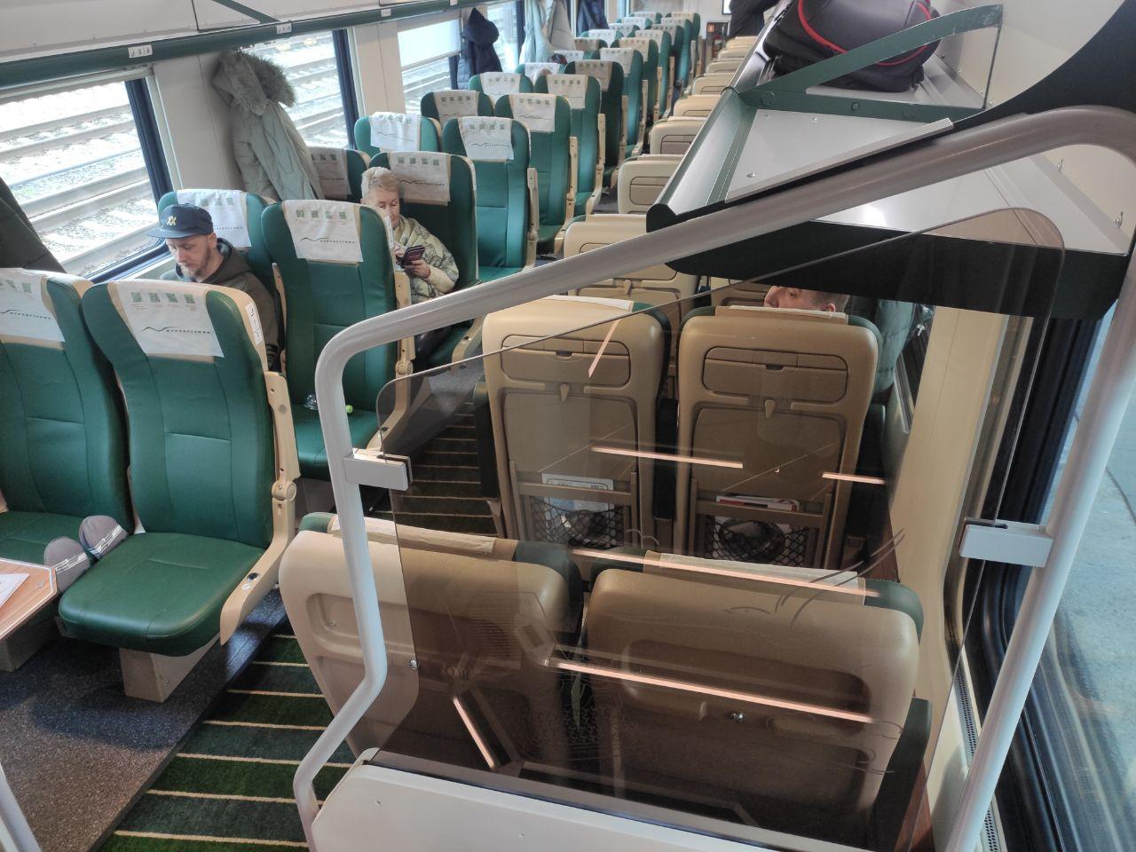 После отправления включаются розетки, расположенные под креслами. Через бортовой Wi-Fi можно подключиться к развлекательной системе и, например, сделать заказ из меню. На окнах установлены жалюзи и крючки для одежды, которые двигаются с некоторым усилием. Над каждым местом есть кнопки для индивидуальной подсветки и вызова проводника.