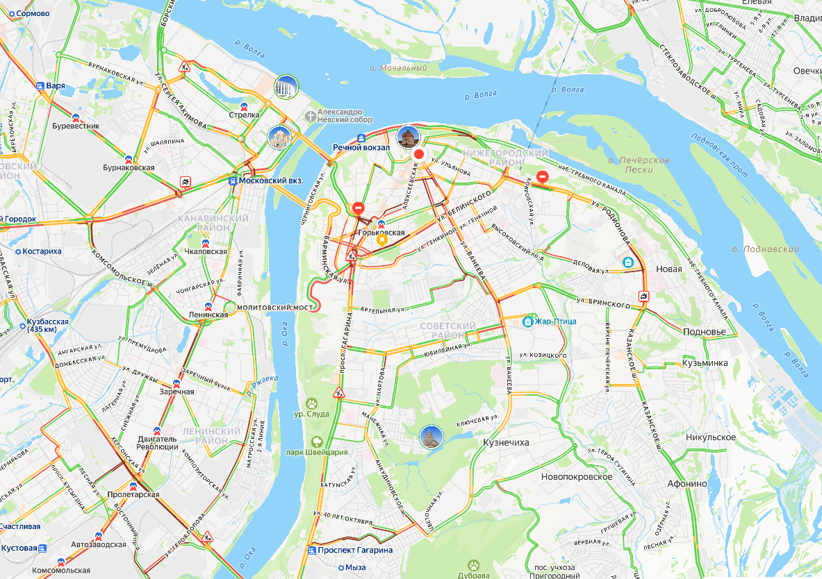 В верхней части Нижнего Новгорода движение практически остановилось на следующих улицах: