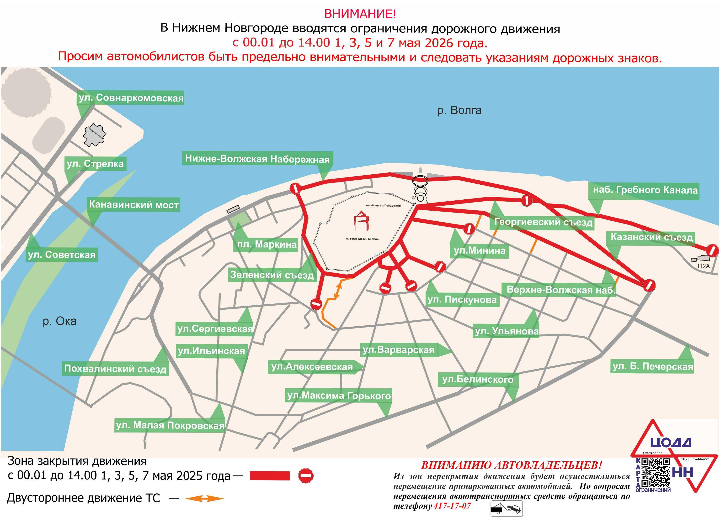 В центральной части города перекрытия для репетиций запланированы на май. С полуночи до 14:00 1, 3, 5 и 7 мая будет запрещён проезд по следующим улицам и площадям: