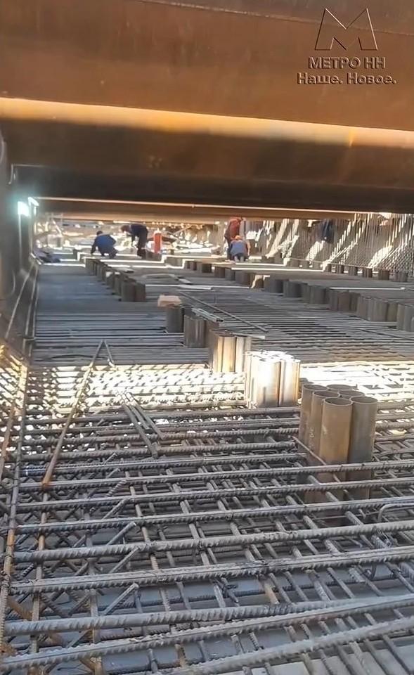 На месте будущей станции нижегородского метро «Сенная» строители формируют блок для размещения технических служб. Работы включают монтаж арматурного каркаса и заливку бетонных конструкций на среднем уровне сооружения.