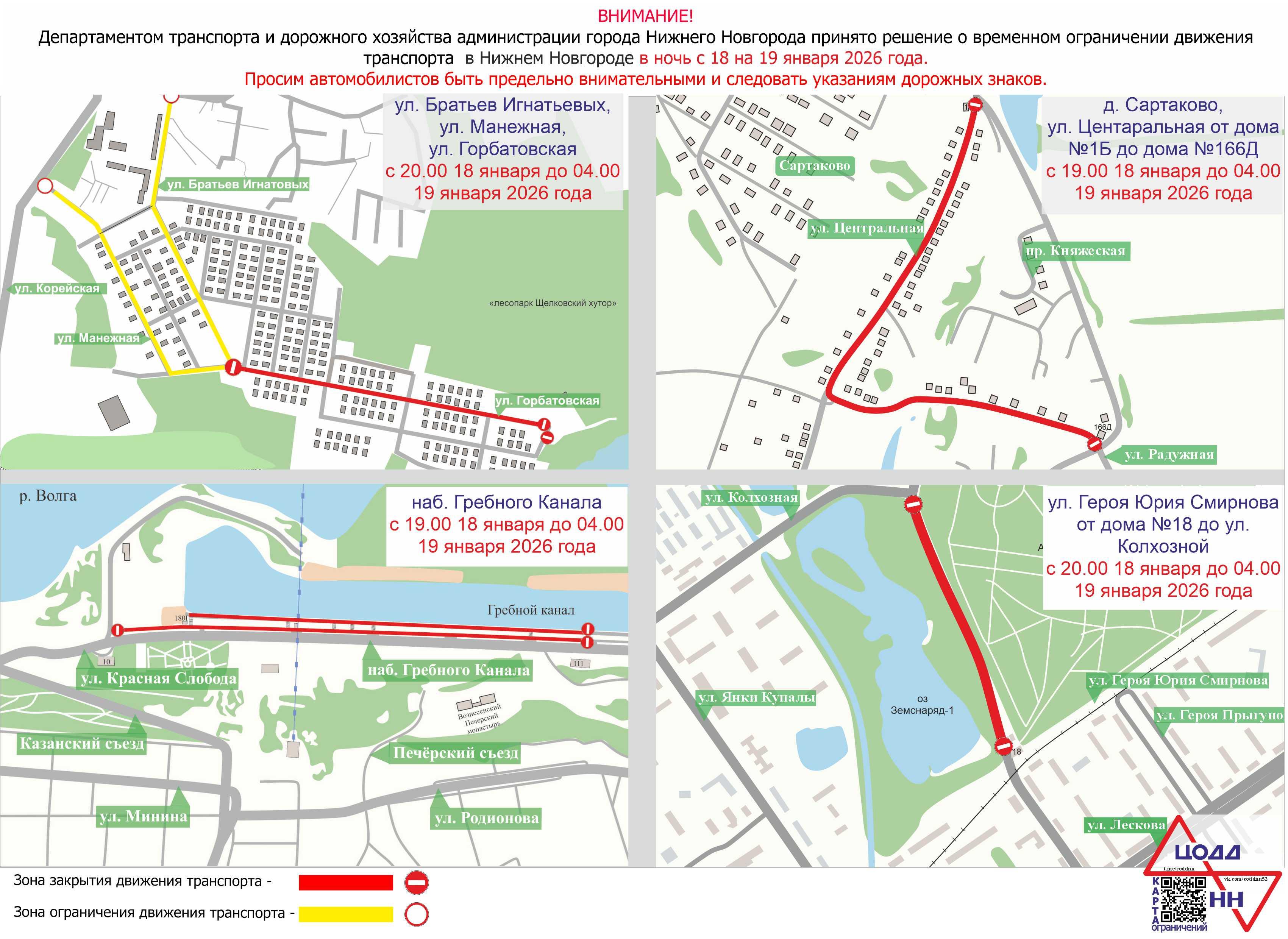 С 20:00 18 января движение остановят на улицах Героя Смирнова (от дома № 18 до улицы Колхозной), Братьев Игнатовых, Манежной и Горбатовской. Все ограничения снимут после 4:00 19 января.