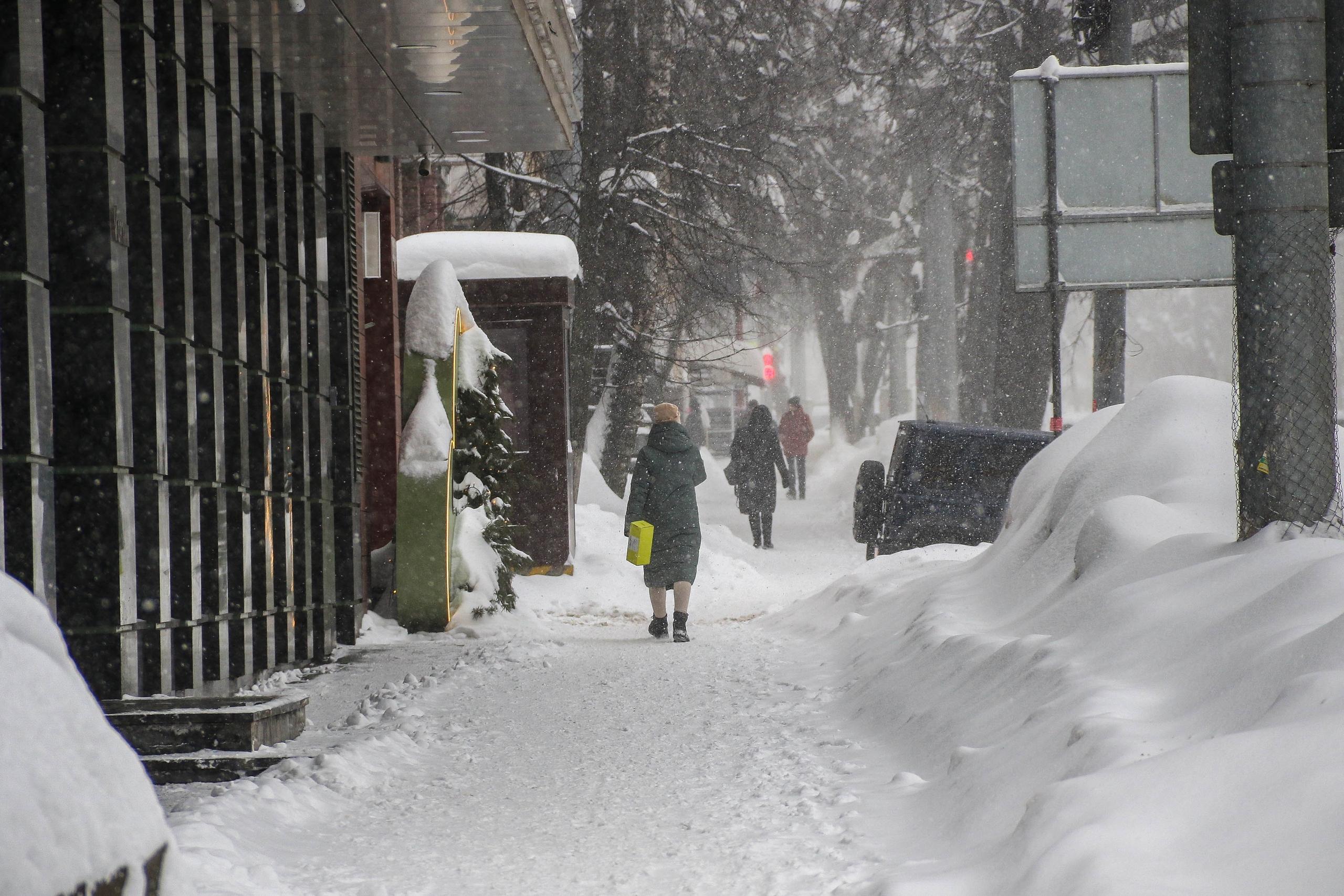 За выходные может выпасть до 30 см снега. Коммунальные службы работают в усиленном режиме, однако на улицах уже образовались высокие сугробы, затрудняющие передвижение.